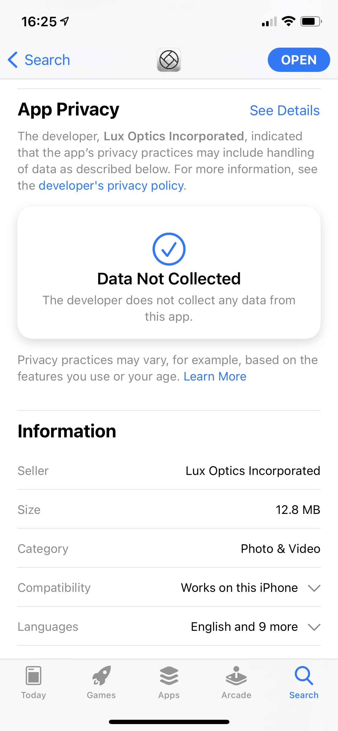 It should say something very direct like “This app does NOT collect any data.”. Instead, the App Store listing includes this extremely awkward set of phrases: