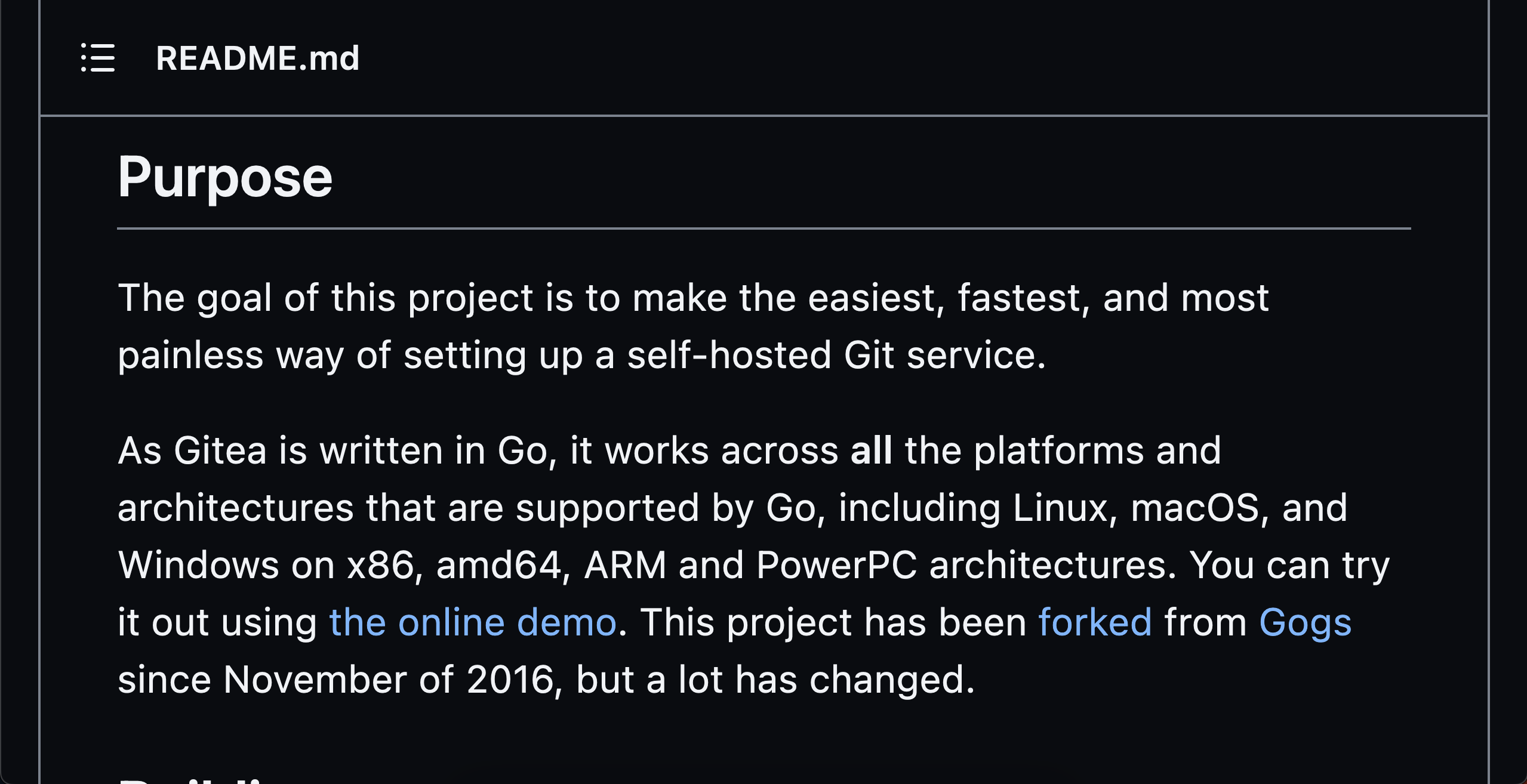 To exemplify this, here's the same markdown from Gitea's home page on both Github and Gothub at the lowest browser zoom (Firefox) that fills the entire viewport.